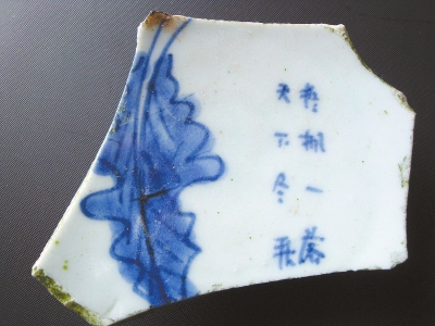 青花乃瓷品中白底蓝花图案的专称,盛产于明清,以钴料为色剂,在洁白胎体上用毛笔勾画各种图案,上釉后入窑高温烧制而成。其图秀丽,发色鲜亮,且呈色稳定。此青花瓷残片应为明末清初民窑之作,其浓郁的生活气息,犹如流动水墨之状。似山似水实为叶,其想象空间与艺术感染力,叹为观止!