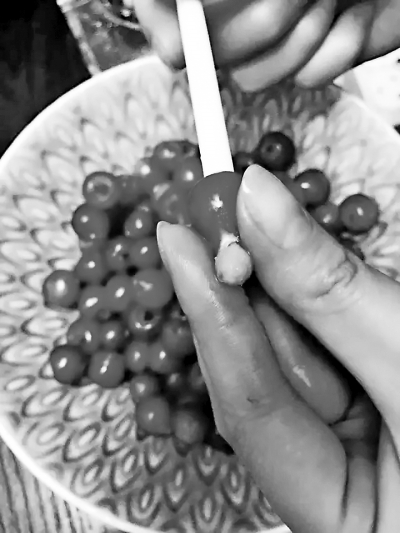 如果您想尽量避免吞下樱桃核,用刀切法去樱桃核又很费时,该怎么办呢?网络居家达人有妙招,可以用吸管或者筷子,直接将核捅出来(如图所示),接着,就放开肚子吃樱桃吧。
