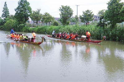 当天龙舟对抗赛在竖新镇的张涨港上进行。鼓声响起,水中龙舟齐发,桨频如一,岸上人群为选手们加油助威。