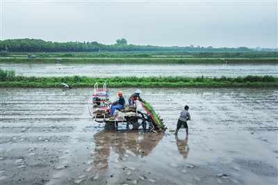 在北湖种植基地,田间地头一片忙碌。伴随着阵阵轰鸣,8台插秧机“火力全开”,将秧苗整齐地插进肥沃的泥土中。不到半小时,一整块水田就换上“新装”,秧苗吐翠,呈现一派生机盎然的景象。