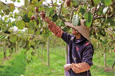 在猕猴桃种植区,一簇簇灰褐色、毛茸茸的猕猴桃悬挂在枝藤上,工人们正忙着采摘。合作社内种植了100亩猕猴桃,主要有“红阳”“徐香”“金槐”“海雁”4个品种,囊括绿心、黄心和红心三个种类。