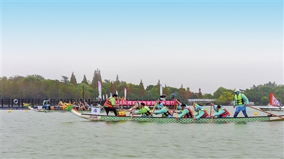 随着一声发令枪响,在风光旖旎的明珠湖上,一艘艘龙舟势如箭发,奋勇争先,明珠湖畔鼓点声声,运动员们踩着鼓点喊着号子挥动船桨,铆足劲、齐发力,冲向终点,展示了体育人顽强拼搏、昂扬奋进的风貌。