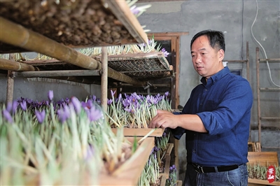 最近是藏红花的盛花期,茅颖锋每天都会查看藏红花的长势情况。“一般来说,藏红花最适宜的环境要保持在15-20℃温度和80%左右湿度,温度偏低,我要拉开窗帘让阳光照射花朵,温度偏高,我就往地面浇水降温。”在他的细心培育下,今年藏红花迎来大丰收。
