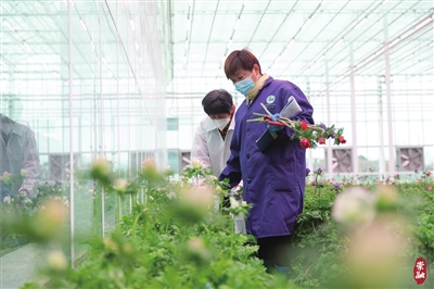 这几天,位于崇明庙镇的兰桂琪农业科技崇明基地内,红的、粉的、紫的……各种颜色的鲜花开满了大棚,让人宛若置身五彩缤纷的“花花世界”。工人们抓紧搬运种苗、分拣花束、制作鲜切花,到处是忙碌的景象。