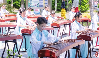 由东门中学、江帆中学、长兴小学等组成的“人人会乐器”方阵,联合表演了多种乐器合奏。口风琴合奏《小松树》动感飞扬,点燃现场欢腾的气氛;葫芦丝合奏《万疆》让人沉浸式感受了中华传统文化的魅力;古筝演奏《丰收锣鼓》节奏轻快,余音萦绕。