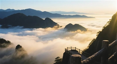 攀至中段,忽遇山风穿峡而过,带着松涛的轰鸣,竟让我想起李白“西岳峥嵘何壮哉”的诗句。待登上平台回望,来时的险道已缩成一条细线,而云海正从谷中漫涌,将远近峰峦化作浮沉的岛屿。